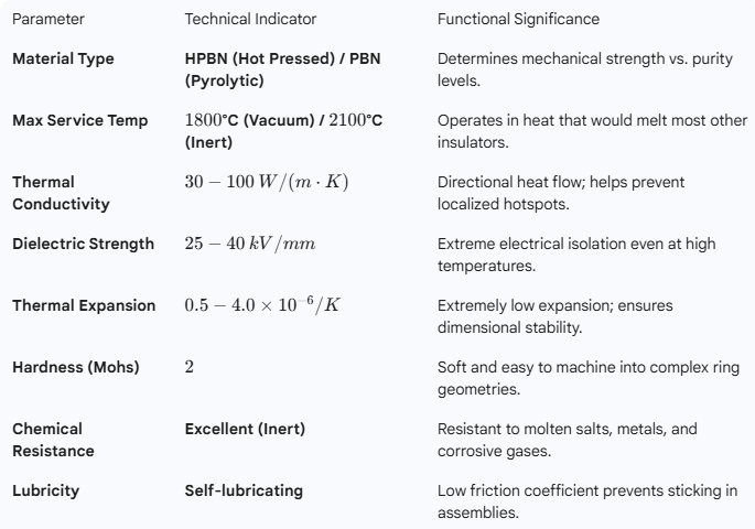 Boron Nitride Rings are specially designed sealing and insulation components for extreme temperature applications. Produced from high-purity boron nitride ceramic, these rings maintain excellent dimensional stability and electrical insulation properties in high-temperature environments, outperforming traditional graphite and ceramic rings through their unique combination of thermal and mechanical properties.
