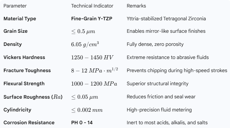 The Fine-Structured Zirconia Ceramic Plunger is the core moving component that enables long-term, stable, and precise operation in high-end fluid drive equipment, representing the ultimate material solution under extreme mechanical, chemical, and purity requirements. It fundamentally overcomes the application limitations of traditional metal plungers (prone to wear, corrosion, and media contamination) and conventional engineering ceramic plungers (susceptible to brittle fracture). By employing Y-TZP zirconia ceramic with its transformation toughening effect and incorporating precise structural design (e.g., stress-optimized profiles, integrated cooling channels), this plunger maintains micron-level motion accuracy, near-zero wear rate, and absolute media purity while withstanding high pressure, high-frequency reciprocating motion, and harsh chemical environments. It is a revolutionary component that enhances the reliability and efficiency of high-value processes.
