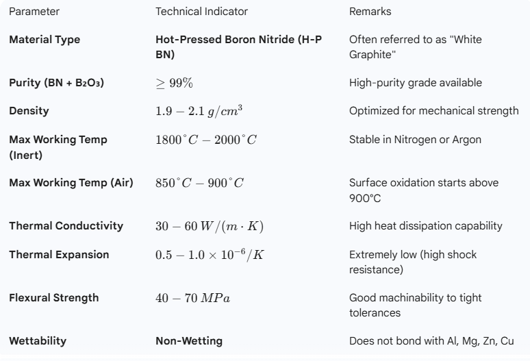 Excellent non-wetting performance to molten metals, high temperature resistance, outstanding thermal shock resistance, high chemical stability and corrosion resistance, good electrical insulation, smooth surface finish with minimal buildup