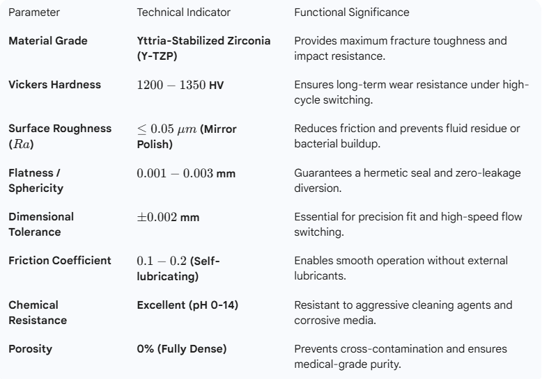 Precision Zirconia Ceramic Diverter Valve Cores/Seats represent the ultimate pursuit of reliability, purity, and longevity in high-end fluid control applications. Compared to traditional metal, plastic, or ordinary ceramic valve components, the valve cores manufactured from high-performance Y-TZP ceramics fundamentally solve failure issues caused by wear, corrosion, or brittle fracture in applications involving abrasive, corrosive media, or high-frequency operation, thanks to their unique transformation toughening mechanism. It is not merely a component but a critical element ensuring the long-term, stable, and contamination-free operation of the entire fluid system.