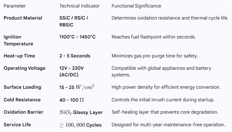 Material Characteristics: Ultra-high operating temperature (up to 1600°C), Exceptional thermal conductivity (>100 W/m·K), Rapid thermal response (reaches ignition temperature in seconds), High oxidation and corrosion resistance, Low thermal expansion coefficient, Superior mechanical strength at elevated temperatures, Excellent resistance to thermal shock