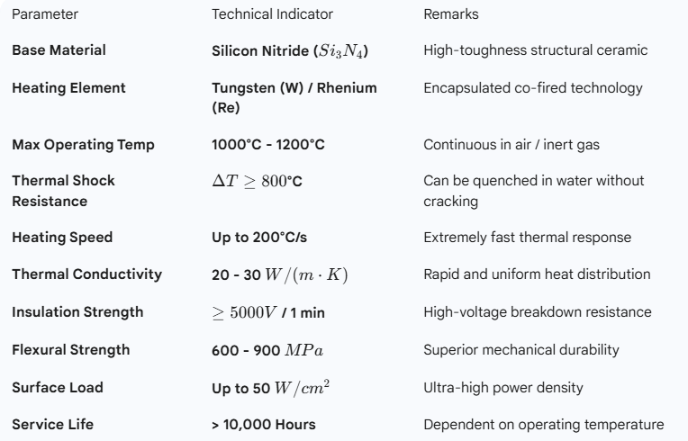 Product Material: Hot-Pressed Silicon Nitride (HPSN) or Gas-Pressure Sintered Silicon Nitride (GPSN), Tungsten (W) heating circuit