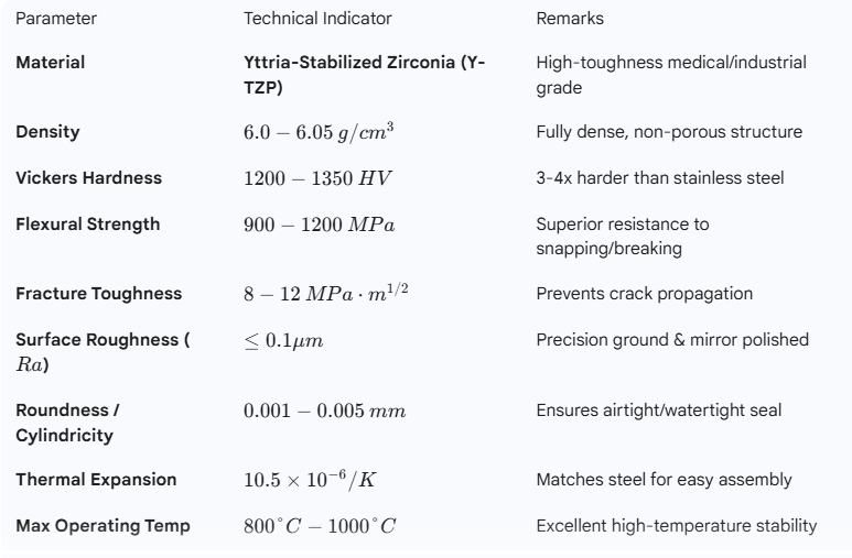 Exceptional fracture toughness (highest among ceramics, K₁c: 8-12 MPa·m¹ᐟ²) and high impact resistance, Ultra-high hardness (HV >1200) and extremely low wear rate, Excellent chemical corrosion resistance (resistant to strong acids, alkalis, organic solvents, and salts), High mechanical strength and flexural strength (>1000 MPa), Low friction coefficient, Good thermal shock resistance, Moderate coefficient of thermal expansion (~10×10⁻⁶/K) compatible with various metals, Material is pure with no risk of metal ion leaching, Good electrical insulation.