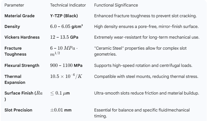 Hardness >1200 HV, wear-resistant, thermal stable (1000°C), low conductivity (2.5–3.0 W/m·K), flexural strength >900 MPa, corrosion/UV-resistant, insulating, non-magnetic, permanent black (L* <20), dense (>6.0 g/cm³)
