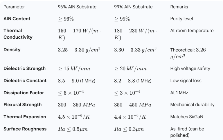 High thermal conductivity up to 150–200 W/m·K, low thermal expansion coefficient compatible with semiconductor materials, excellent electrical insulation, high temperature stability up to 1800℃, strong chemical inertness, smooth surface finish suitable for precision electronic packaging