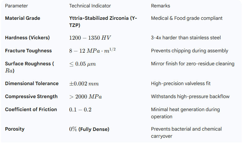 Exceptional fracture toughness (impact resistant, K₁c: 8-12 MPa·m¹ᐟ²), Ultra-high hardness (HV >1200) and extremely low wear rate, Superior chemical corrosion resistance (tolerant to strong acids, alkalis, organic solvents, and Li-ion battery electrolytes), Extremely low metal ion leaching and zero magnetic properties, Good biocompatibility and food safety, Moderate coefficient of thermal expansion (~10×10⁻⁶/K) compatible with various metals, Capable of achieving nano-level ultra-smooth surfaces (Ra < 0.02 µm) to reduce flow resistance and adhesion, High mechanical and flexural strength (>1000 MPa).